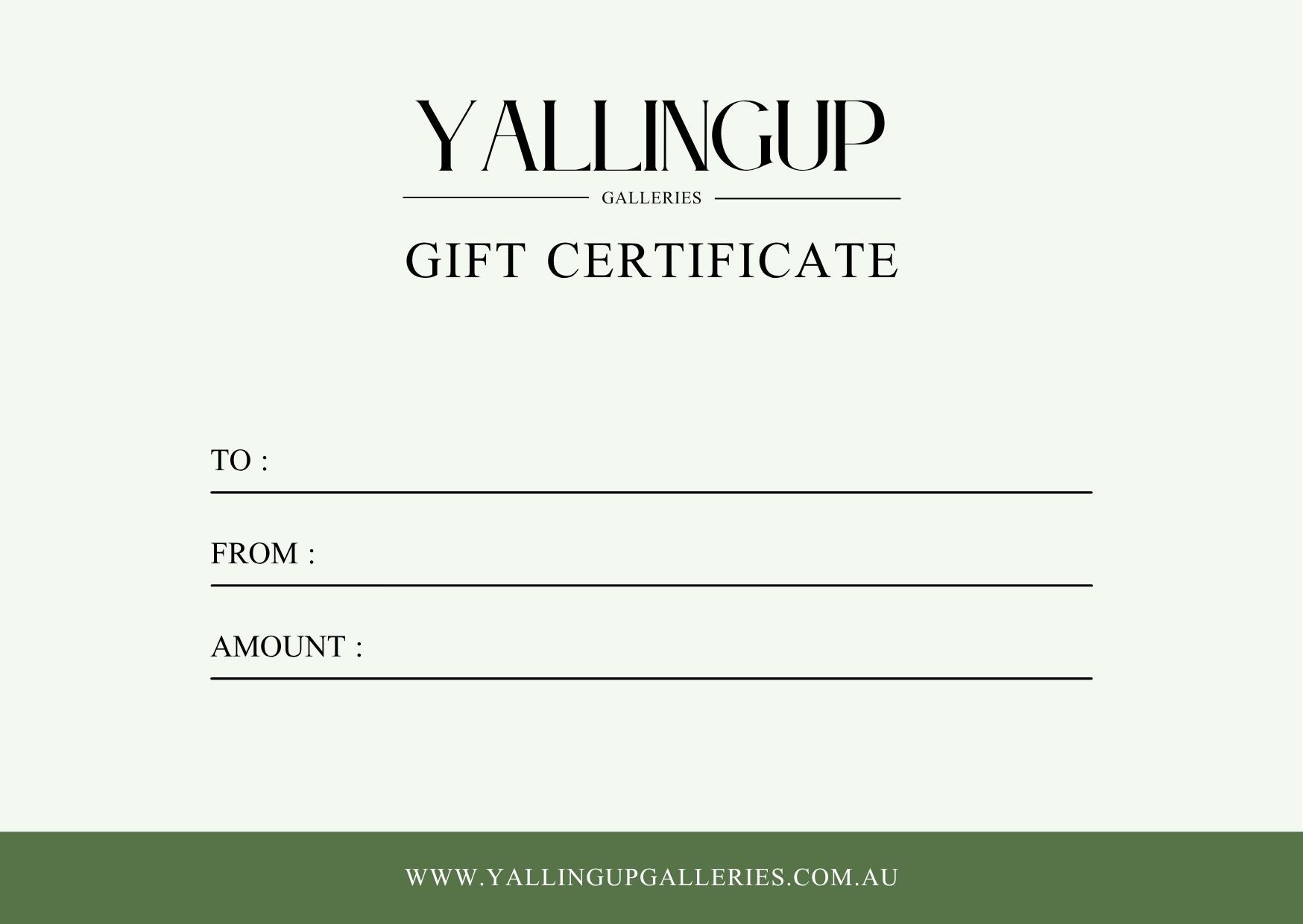 Purchasing a Yallingup Galleries gift certificate is via phone or email to arrange your gift certificate for any desired amount. We'll provide you with a beautifully designed certificate ready to be presented to your loved one.