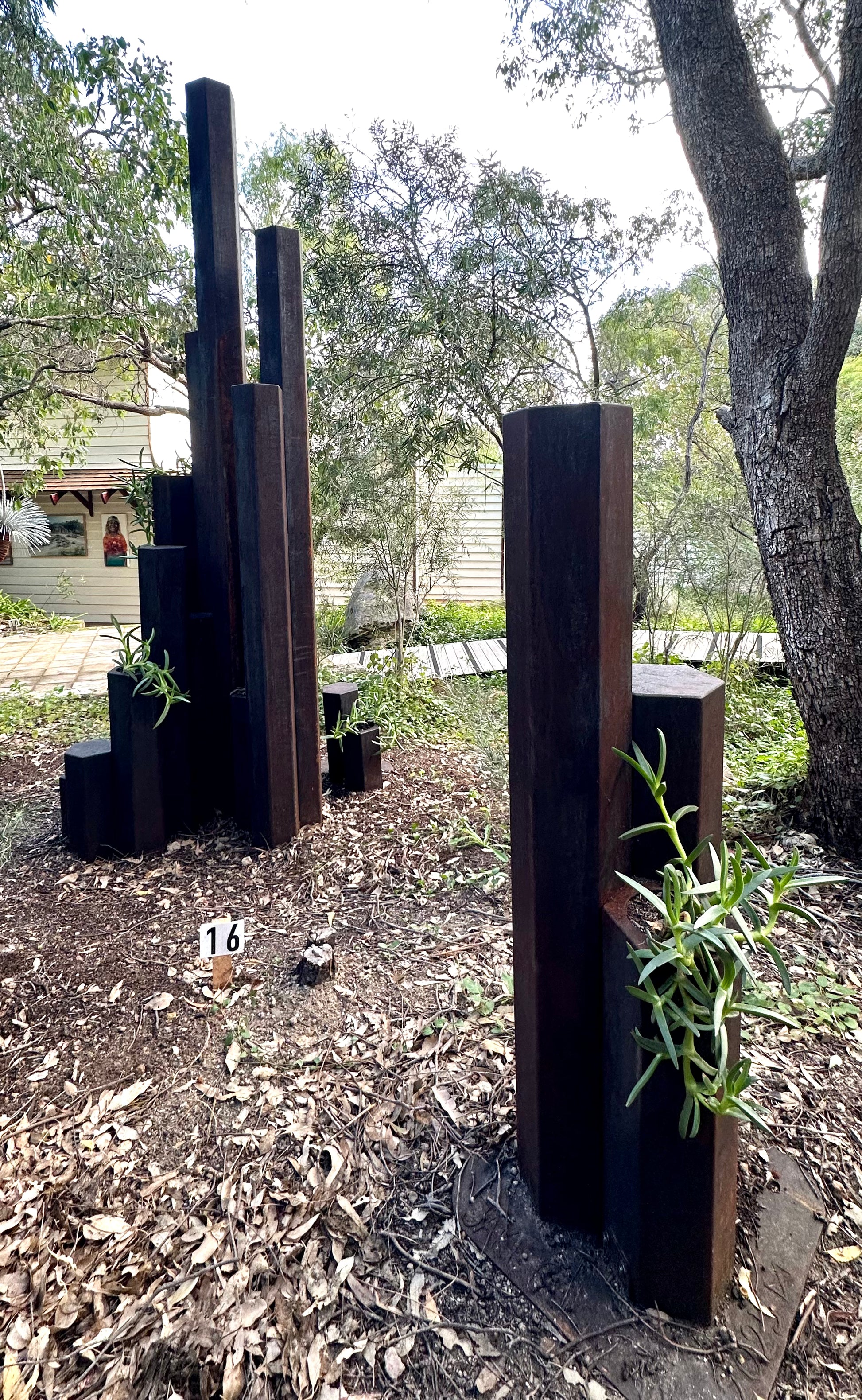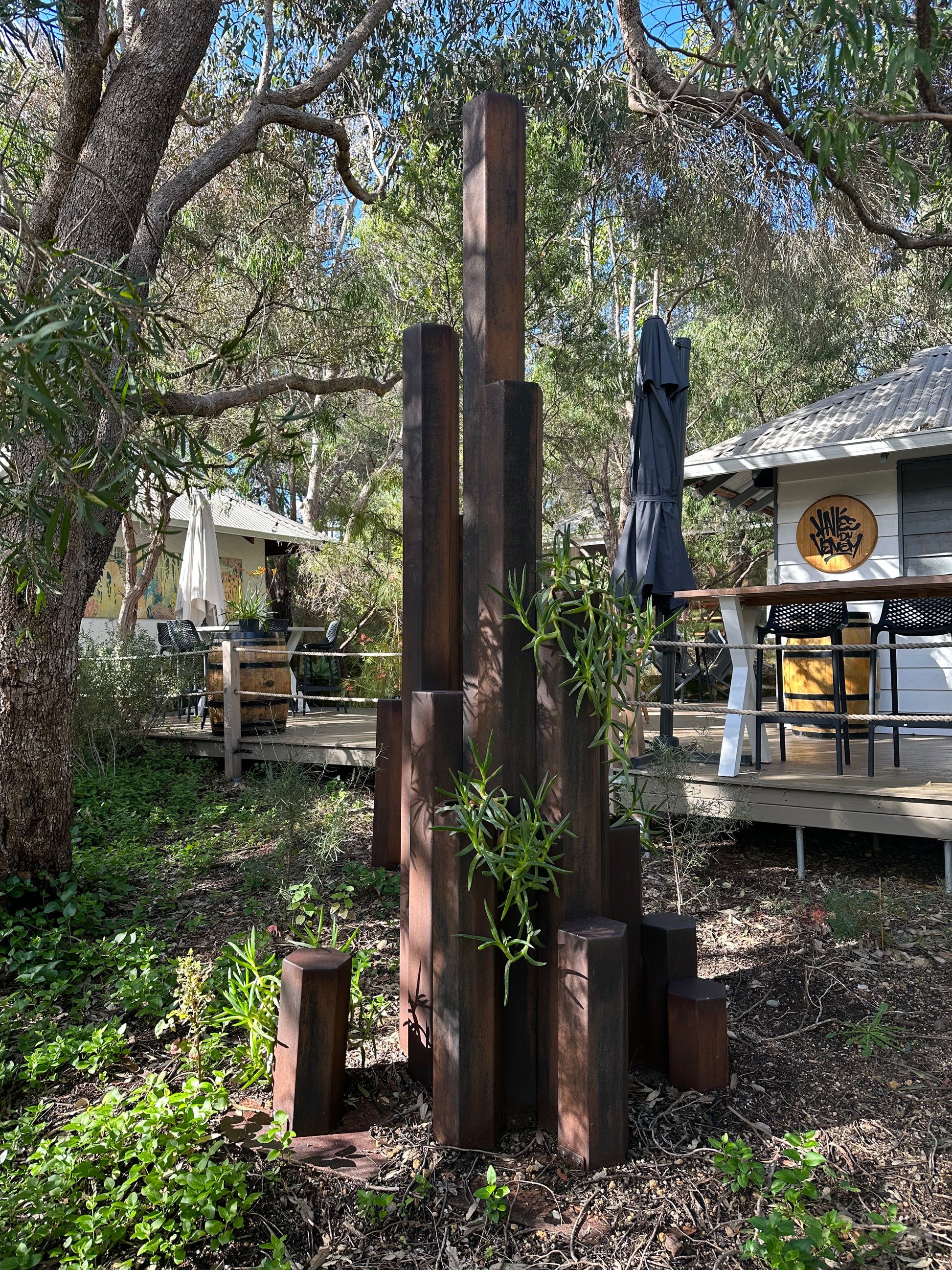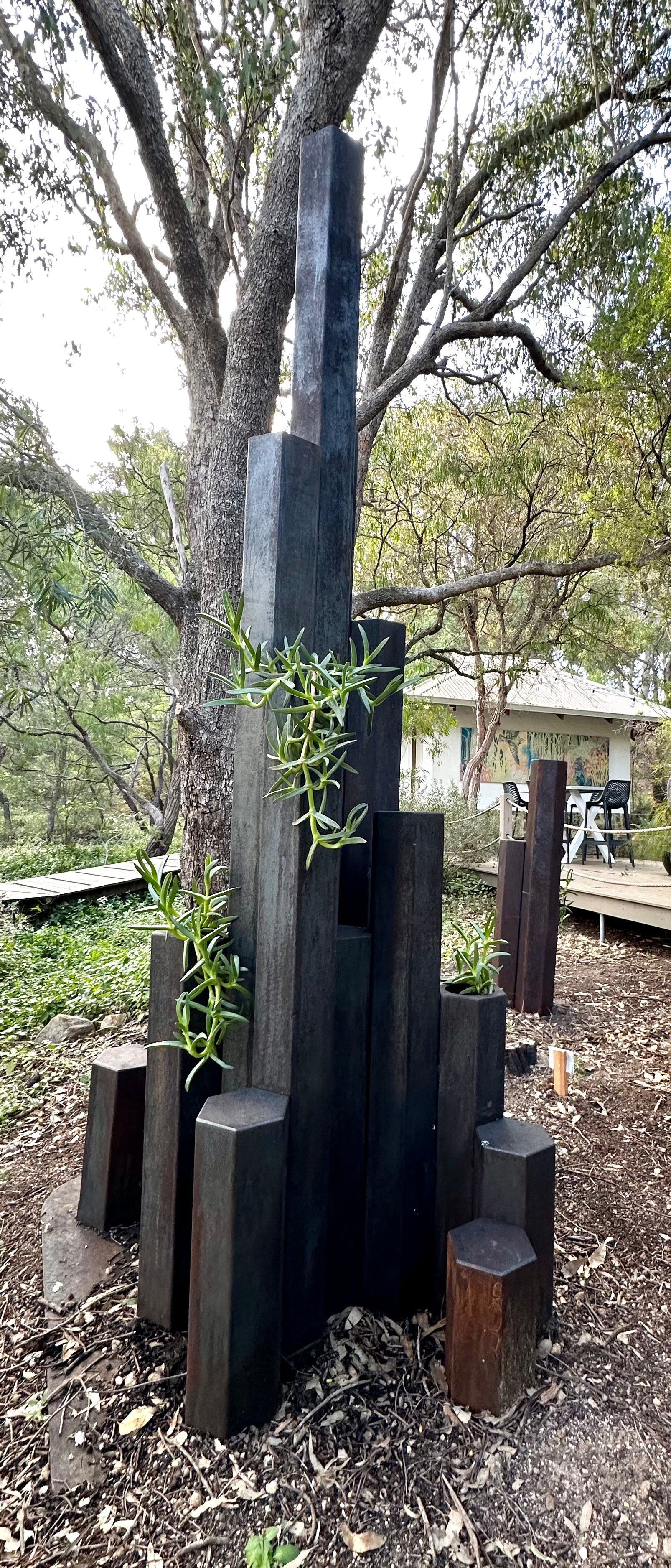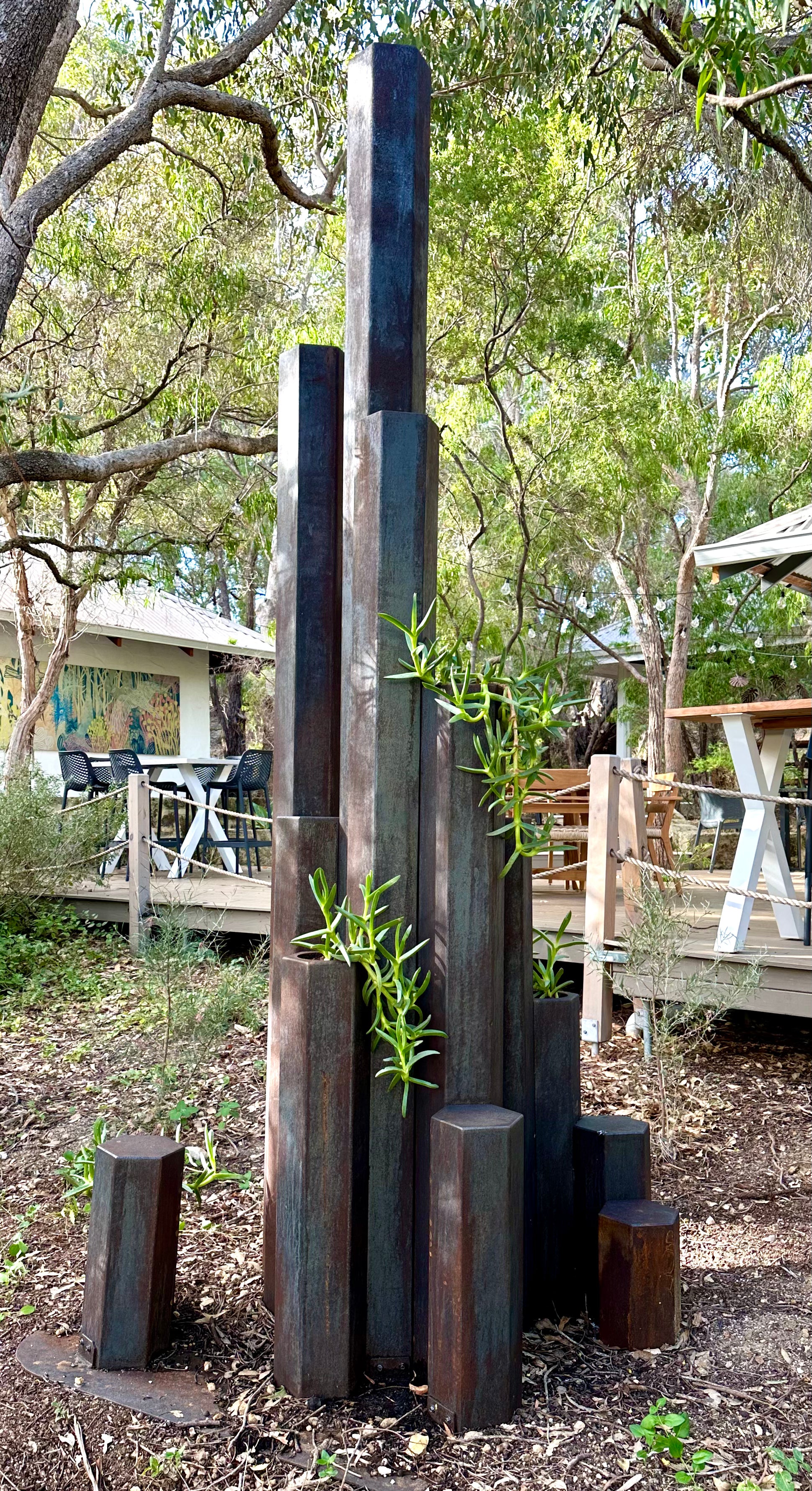 Corten weathering steel, Pigface plant Artwork information: The inspiration for this sculpture is an outcrop of hexagonal basalt columns formed 135 million years ago in the D’Entrecasteaux national park known as Black Point.