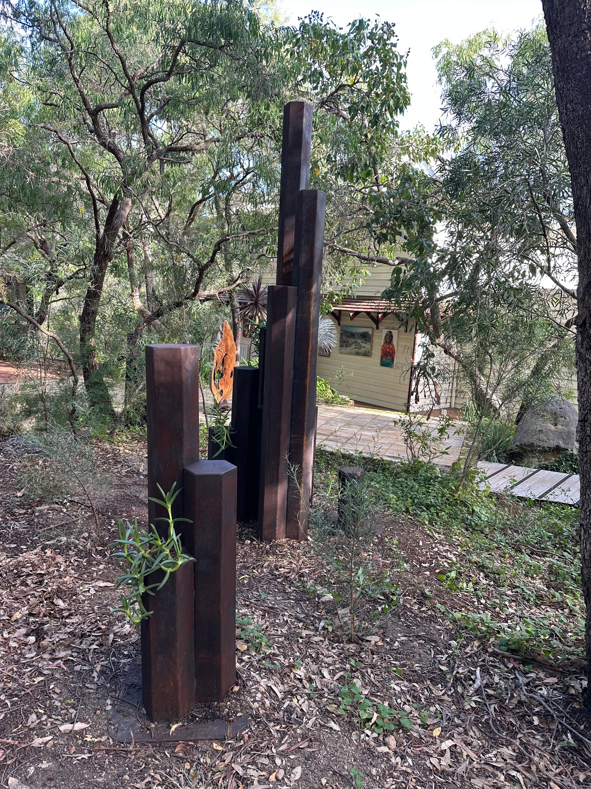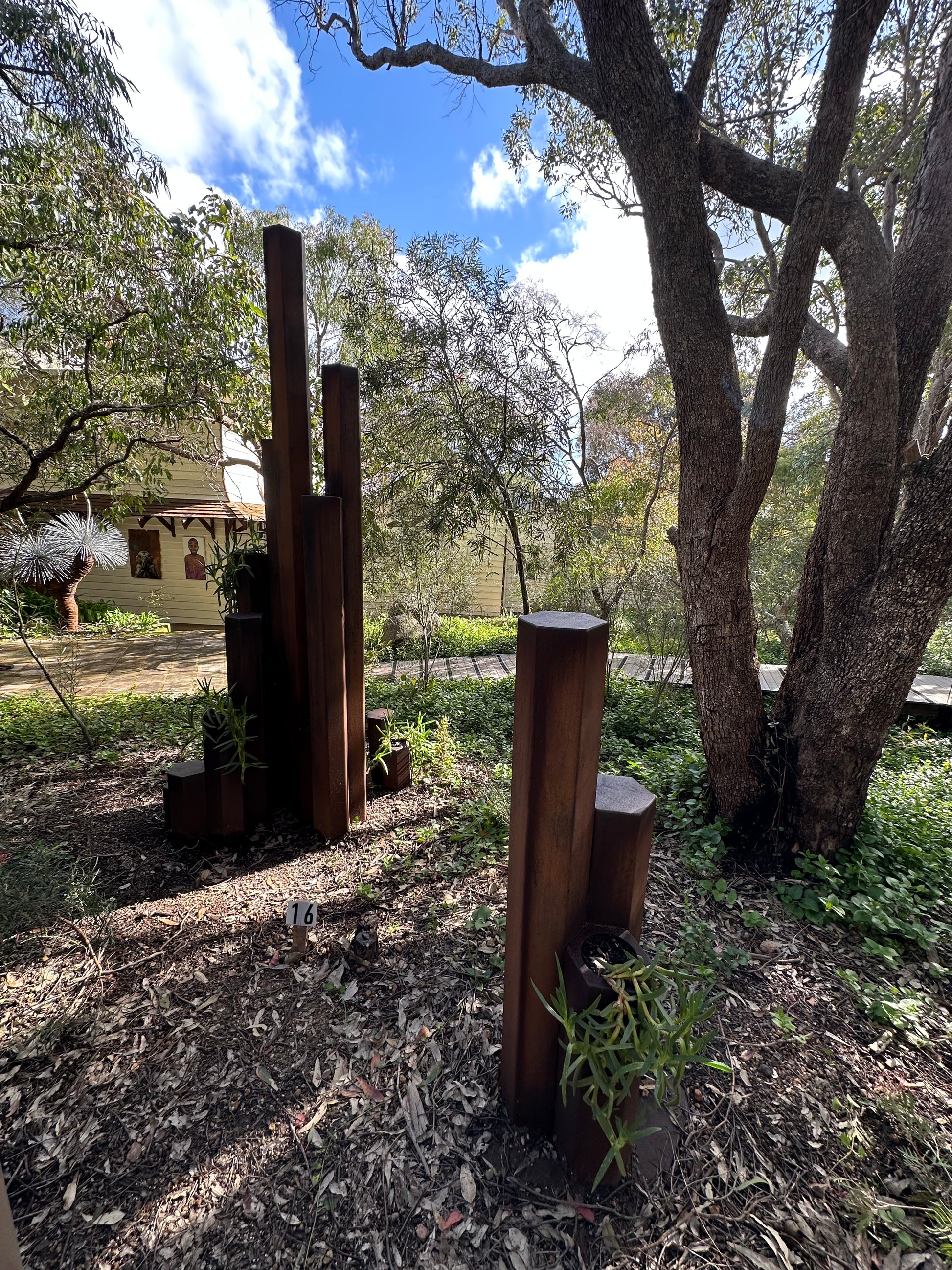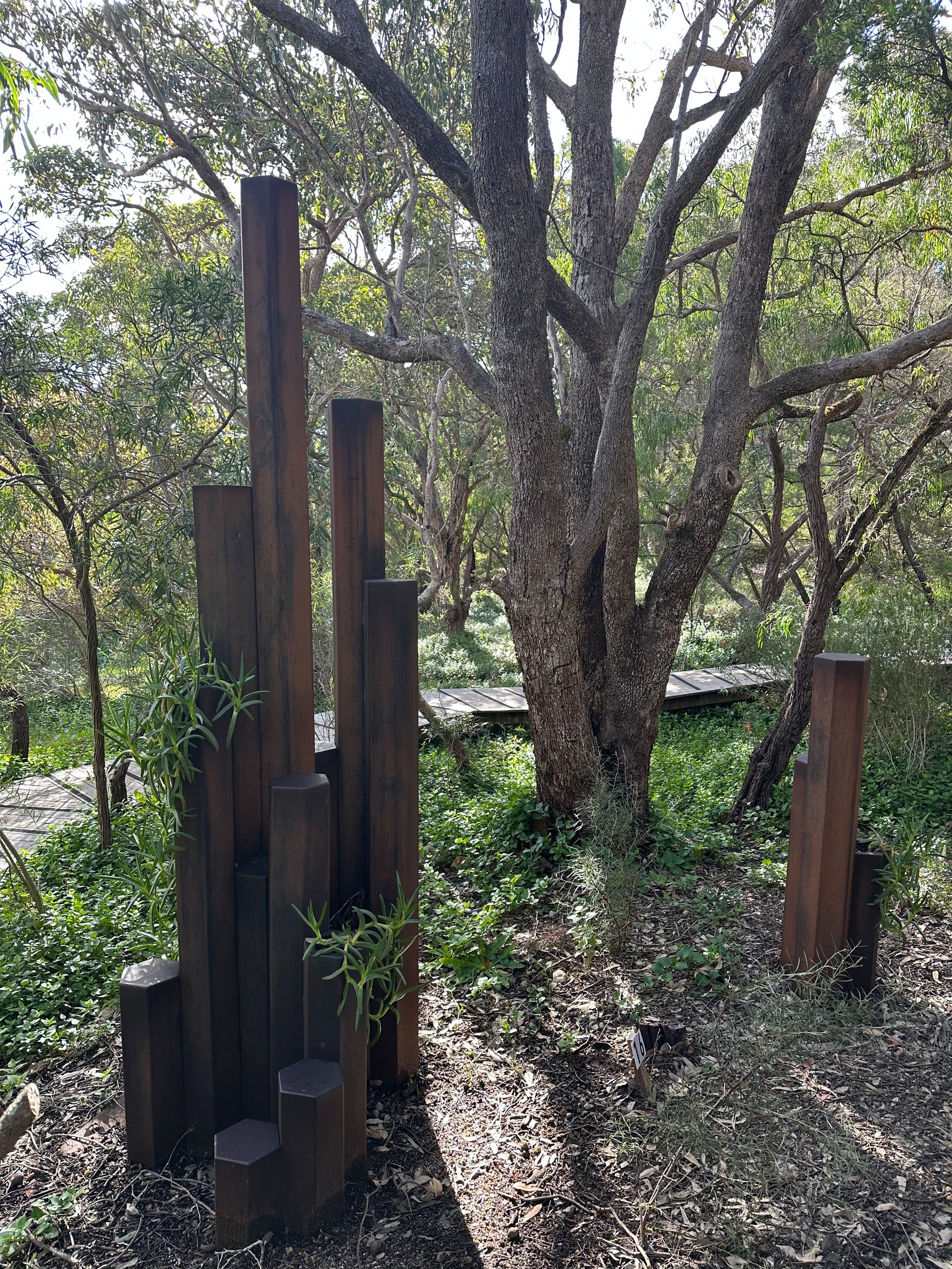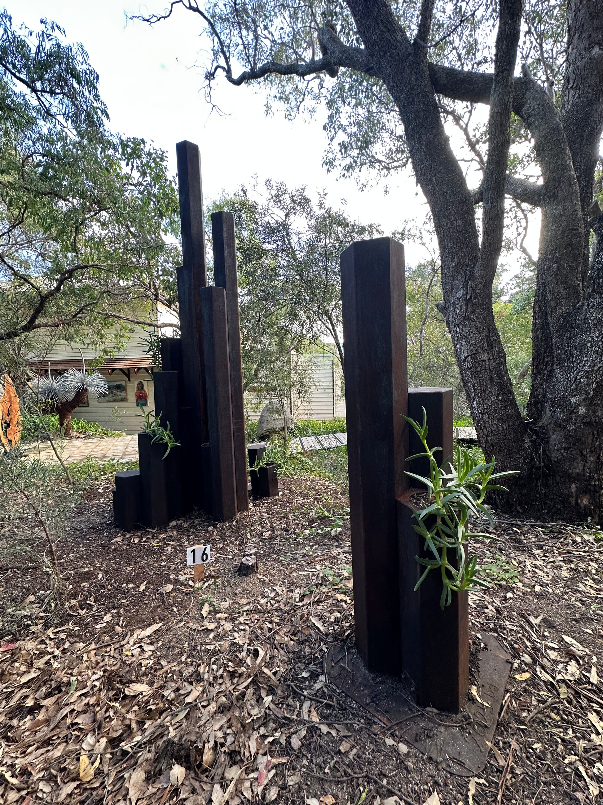 Corten weathering steel, Pigface plant Artwork information: The inspiration for this sculpture is an outcrop of hexagonal basalt columns formed 135 million years ago in the D’Entrecasteaux national park known as Black Point.