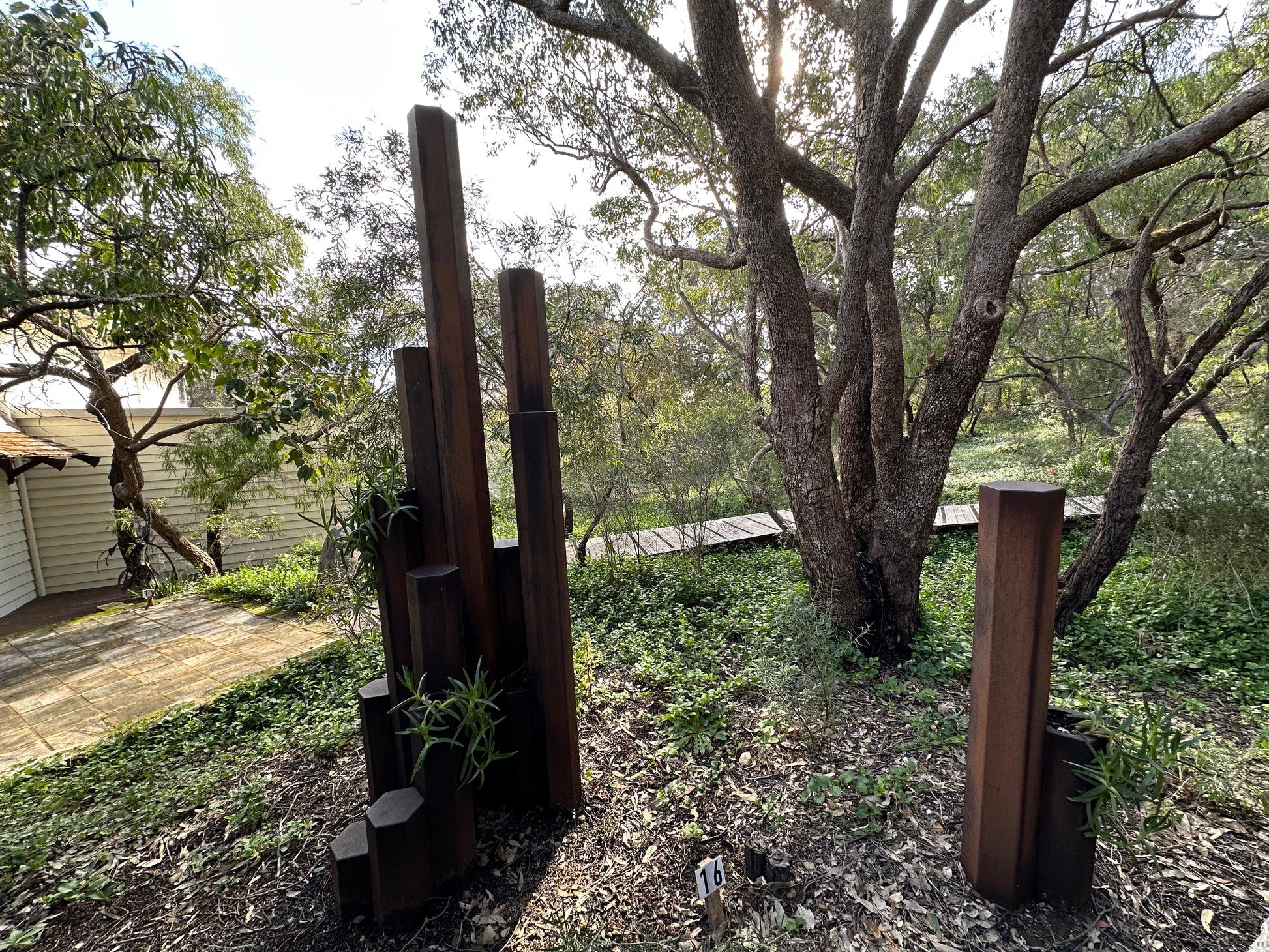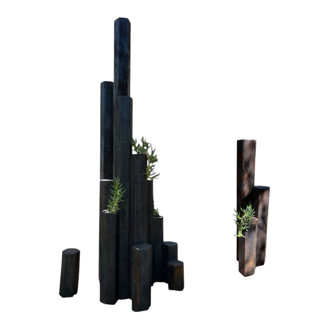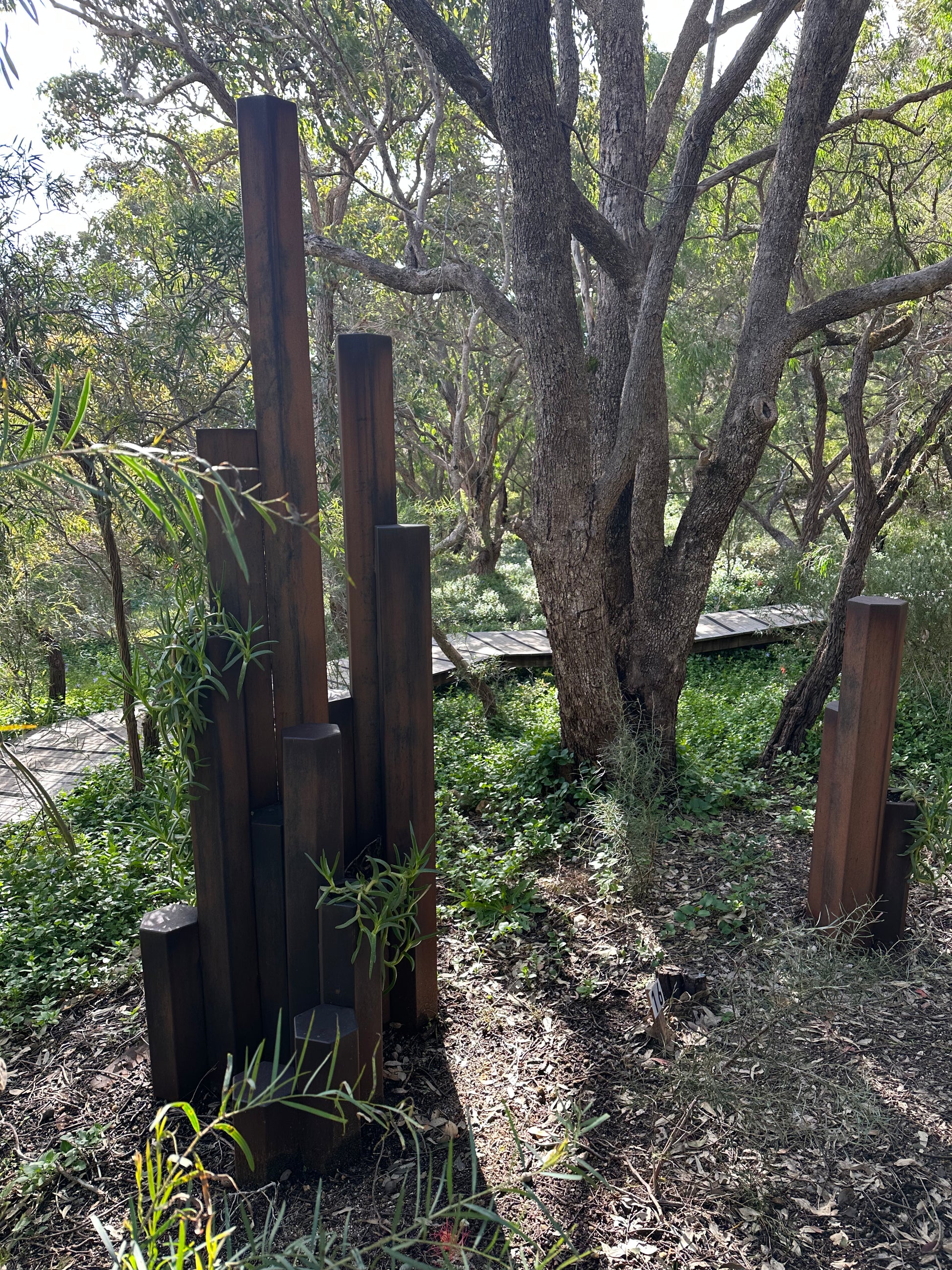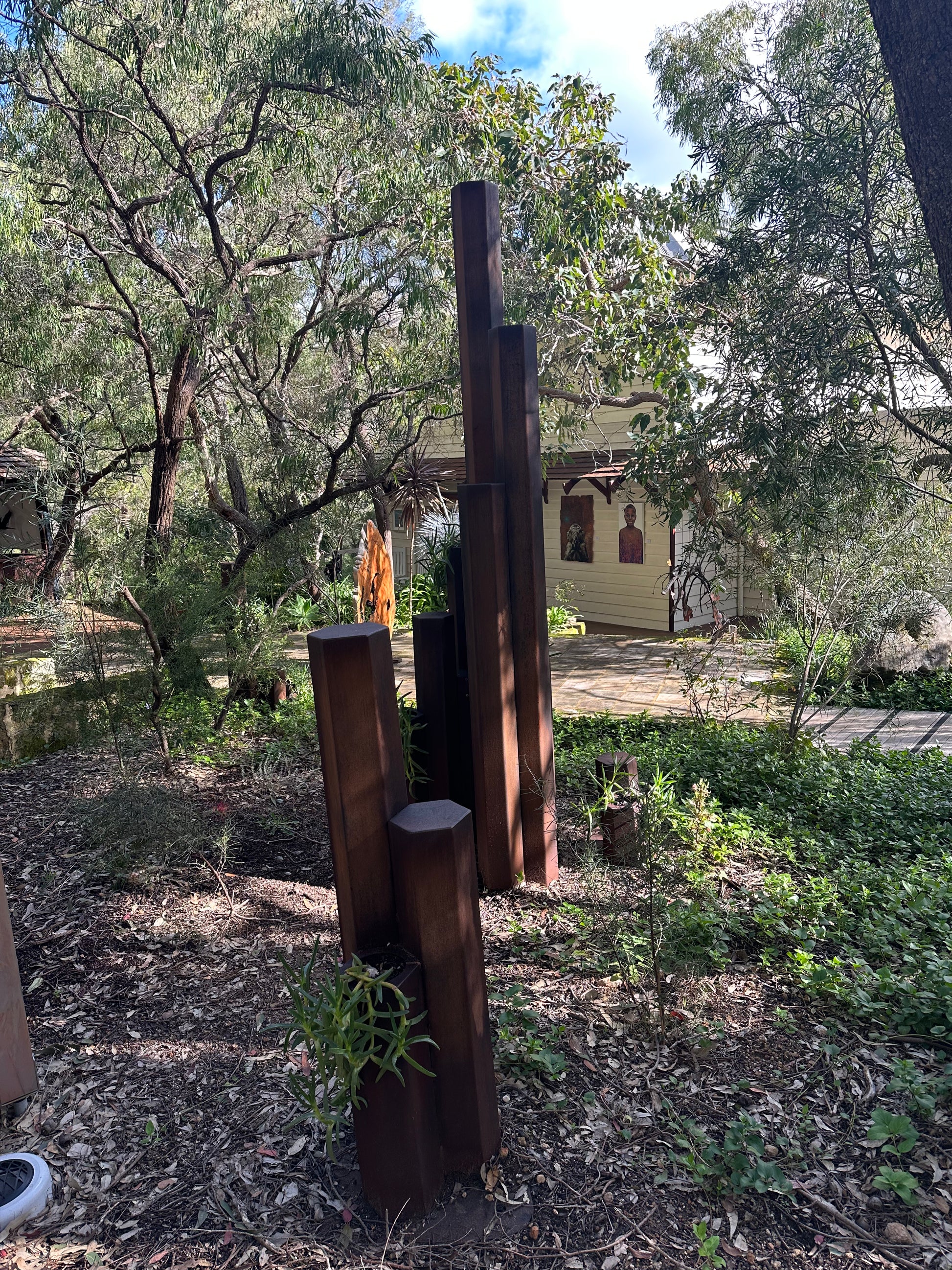 Corten weathering steel, Pigface plant Artwork information: The inspiration for this sculpture is an outcrop of hexagonal basalt columns formed 135 million years ago in the D’Entrecasteaux national park known as Black Point.