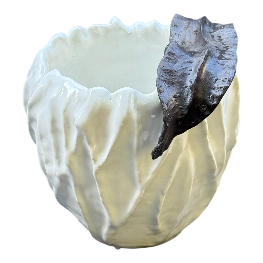 This vase blends two clay bodies: glossy white porcelain and a single sculptural black clay form that drapes over the edge.
