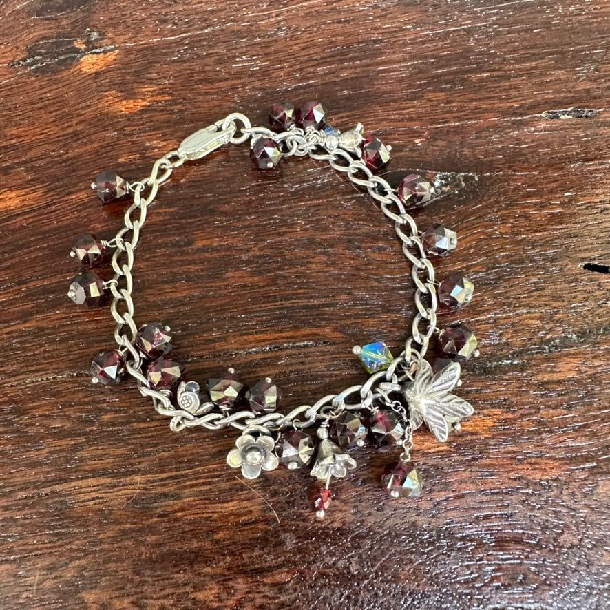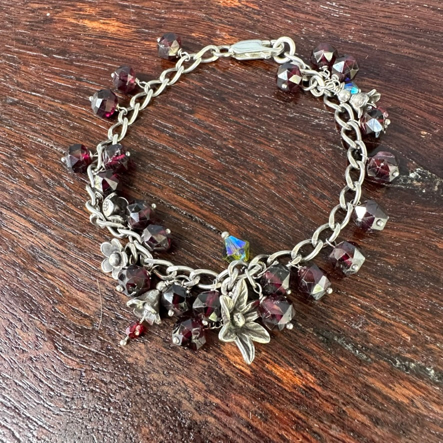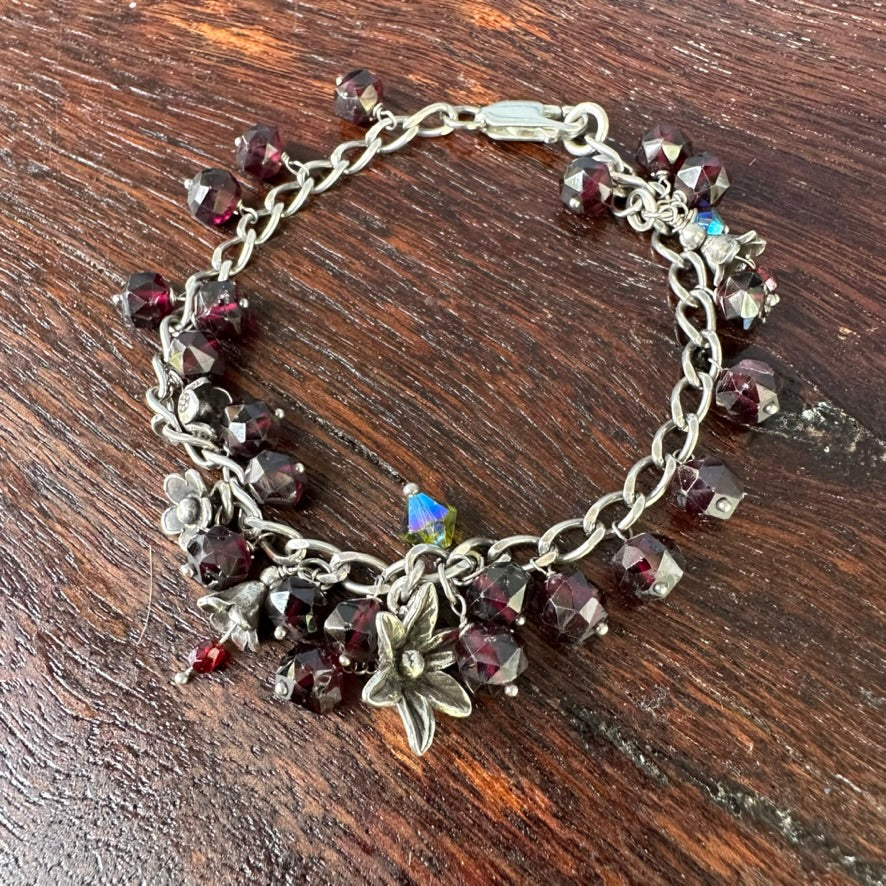 Facetted garnets from Gemtree Australia, collected 23 years ago. Swarovski crystals and 925 silver chain and flowers.