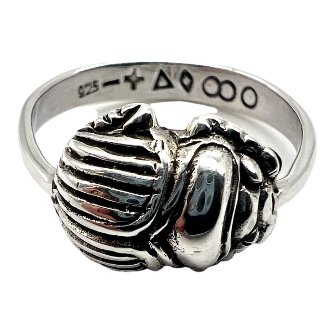 An exquisite artisan made ring, that has a hand cast silver scarab beetle attached to a silver band.